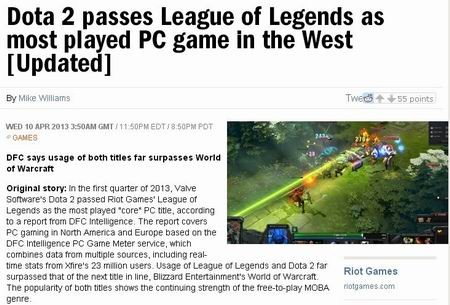 据欧美著名数据统计机构DFCIntelligence最新一份报告显示:在2013年的第一季度里,DOTA2在用户游戏总时间上表现强势,超越了由RIOT所开发的《英雄联盟》,跻身成为欧美网游市场最热门的游戏。而曾经的王者《魔兽世界》位居第三。