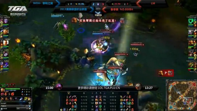 上路鳄鱼与螳螂拼的很凶,两者逃生能力都很强所以在对单时没有继续爆发人头,WOA打野赵信见状果断支援上路冲塔拿下鳄鱼。之后LM选择拿下第二条小龙,WOA见状想要留人,但是卡兹克切入时机不好瞬间被秒,天使也杀掉锤石还以颜色。比赛进行16分钟,LM拿下三路外塔,经济领先6K。