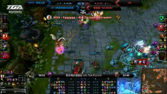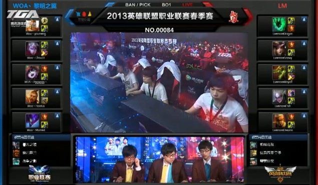 英雄联盟职业联赛春季赛第六周第一比赛日第一场比赛由WOA对阵LM。WOA Ban掉了慎、石头人、人马;LM Ban掉了兰博、皇子、琴女。WOA选择了天使、韦鲁斯、露露、赵信、卡兹克;LM选择了锤石、女警、鳄鱼、皎月、盲僧。