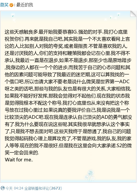 而S2一战出名的WEADC微笑显的压力很大,这一年来被国人甚至全国都冠以世界第一ADC的称号,看来对微笑自己是一个沉重的负担,以至于输掉这次比赛后难以平复自己的内心,于是在凌晨4:24发表了自己心中的难言。从文中看微笑已攻克自己的瓶颈找会自己的状态,那我们就一起期待WE的再次回归!