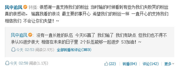 昨日SWL总决赛赛后,就当IG拿下比赛的那个时刻相信WE的粉丝们肯定伤心不止。WE的队员们更新难以入睡,就在凌晨2:55队长若风像大哥哥般安慰自己的兄弟们,不要气馁我们会以自己的方式去拿会属于我们的荣誉!