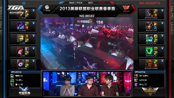 英雄联盟职业联赛春季赛第七周第二比赛日第三场比赛由WE和iG带来的巅峰对决。iG ban掉了琴女、扎克、慎,WE ban掉了死歌、皎月、维鲁斯;iG选择了鳄鱼、露露、皇子、女枪、螳螂,WE选择了卡牌、女警、人马、锤石、石头人。
