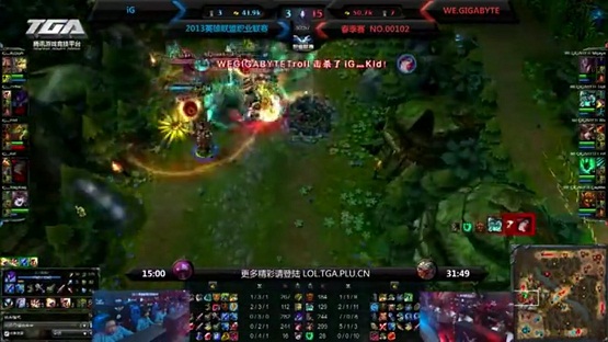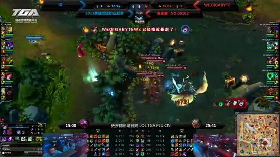 WE在中路两次利用锤石的神钩秒掉对方英雄,WE利用人数上的优势推掉iG的外塔和小龙,WE在上路先将露露打残,虽然iG先手到3人女枪完美大招但经济上落后5千的差距却让卡牌拿下3杀完成团灭。卷毛再次埋伏钩到螳螂,卡牌人马开大留人打出0换4后,WE拿下iG的基地,取得国家德比的胜利。