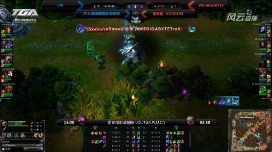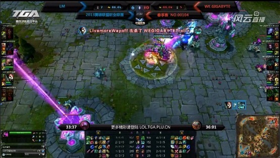 LM的小丑将WE的上路带通关,WE在下路杀掉2人时却被小丑带掉中路,回防的人马也被小丑杀死。WE的3路高低被LM破掉两次,但是WE依然依靠团队的防御两次防守住LM的推进。但LM最后还是依靠神装的小丑将WE最后一座基地塔拆爆,LM最终获得比赛的胜利。