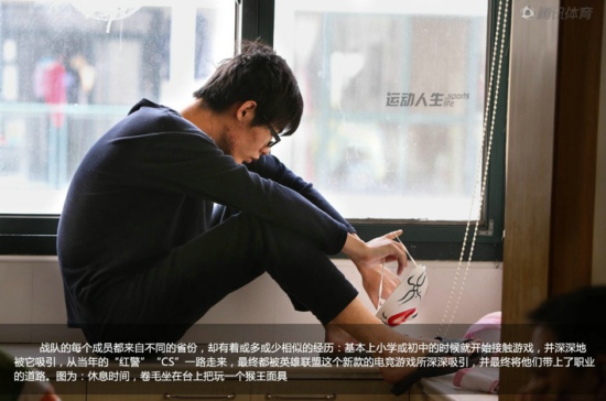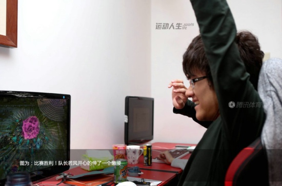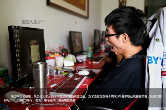 上海市宝山区大学路的一间顶楼复式单元内,客厅被5张长桌和8台电脑塞得满满的,这就是在电竞界赫赫有名的WE英雄联盟战队的**。5位少年卷毛、若风、微笑、诺言、草莓的眼睛紧紧盯着电脑屏幕,房间内回荡的是他们之间简短的交流声和迅速点击鼠标所发出的哒哒的声音。分析师阿布时而在旁边的电脑上整理比赛数据,时而在队员身后观看他们的训练进度。上午起床后个人练习打RANK中(注:英雄联盟游戏排位赛),下午团队集中训练,晚上自由练习,除了午饭和晚饭,队员们大部分的时间都是在电脑前度过的。为了适应现在每个周末LPL春季职业联赛的节奏,队员们都卯足了一口气努力练习。