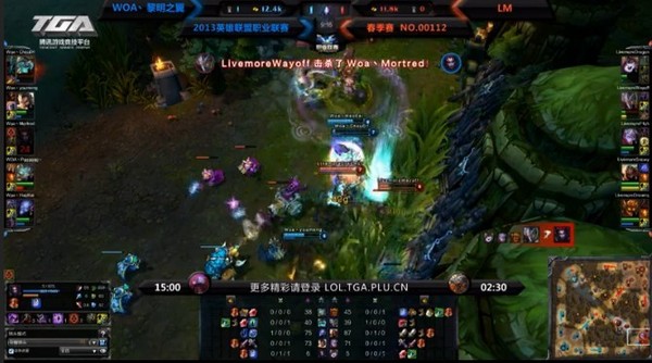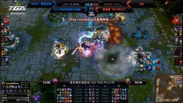 WOA凭借开场的眼位和精彩的战术设计那些了对手劫的一血,7分钟就推掉对手上路一塔,人马GTANK下路,LM凭借慎的大招和石头人的支援完成0换4,顺势拿下小龙。接下来WOA依靠男枪的AOE配合瑞兹推线,LM利用慎推线,双方经济几乎持平。
