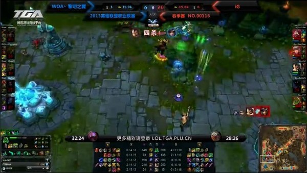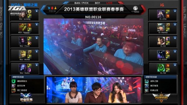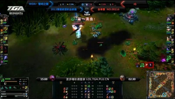 英雄联盟职业联赛春季赛第八周第三比赛日的第一场对抗由WOA迎战iG。WOA ban掉了锤石、皎月、死歌,iG ban掉了人马、小鱼人、兰博;WOA选择了皇子、鳄鱼、蜘蛛、女枪、瑞兹,iG选择了扎克、琴女、男枪、NOC、卡萨丁。