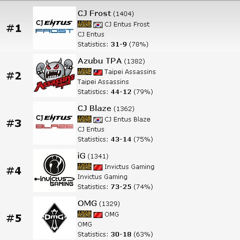 前3名是韩国的CJ Frost、**的TPA、韩国的CJ Blaze。iG、OMG、WE分别排4、5、7名。