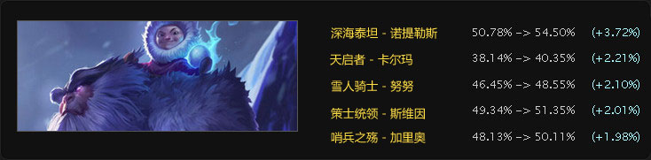 努努的胜率也增加了。目前作为辅助,他还不太成功,所以2%的增长主要是要感谢玩solo的努努玩家,他们经常在欧洲LCS上看到。努努玩家在选择召唤师技能时,35%的情况是选
