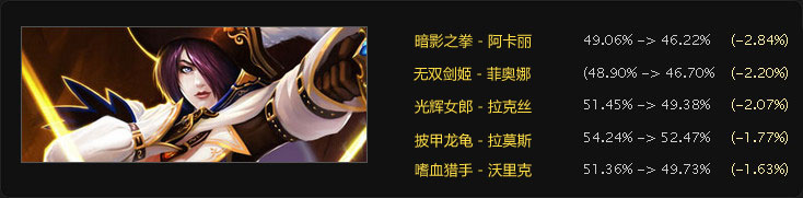阿卡丽被削后,胜率就一直在降。现在,胜率已经低于50%,当前补丁中又新增了红药****限制,这样阿卡丽就不能9红2眼地出装了,显然这个胜率还是要继续下降的。