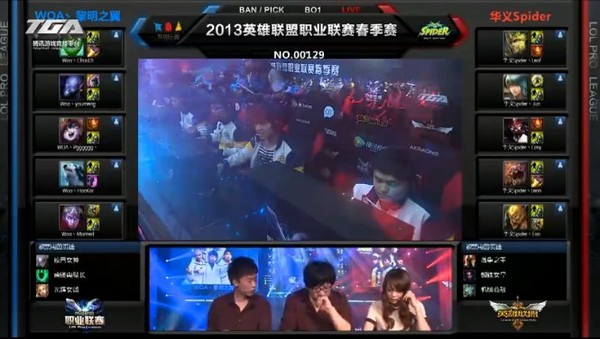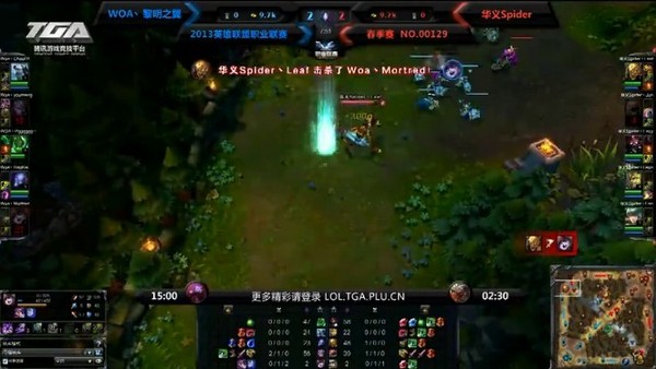 英雄联盟职业联赛春季赛第九周第三比赛日第二场比赛由WOA黎明之翼迎战华义Spider。WOA ban掉了皎月、锤石、拉克丝,华义 ban掉了潘森、蜘蛛、兰博;WOA选择了扎克、瑞兹、露露、狗熊、韦鲁斯,华义选择了皇子、琴女、大虫子、大嘴、猴子。