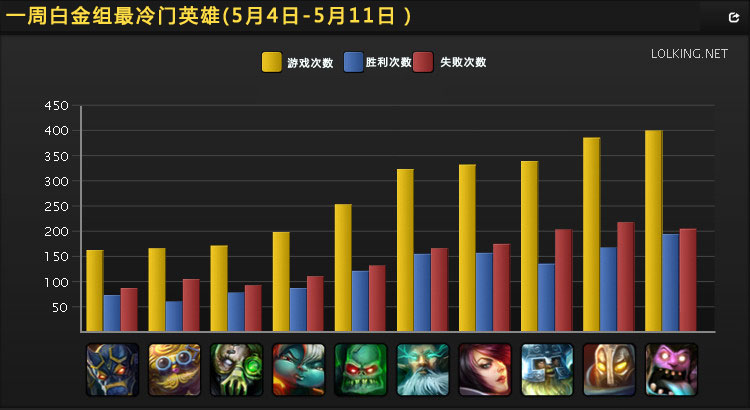 EZ再次成为白金组最热门英雄。加里奥夺走了大头最冷门宝座。胜率榜单上,卡牌、迦娜继续保持前2名地位。德莱文迅速蹿升只第四位,小胡子有挖掘潜力。比较令人在意的是扇子妈好像又要有夺胜率倒一的冲动了。 - -! 新AP英雄丽桑卓从倒一升到了倒六