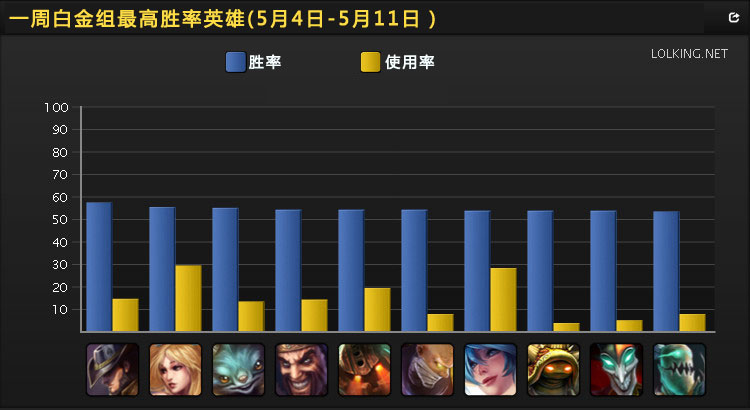 EZ再次成为白金组最热门英雄。加里奥夺走了大头最冷门宝座。胜率榜单上,卡牌、迦娜继续保持前2名地位。德莱文迅速蹿升只第四位,小胡子有挖掘潜力。比较令人在意的是扇子妈好像又要有夺胜率倒一的冲动了。 - -! 新AP英雄丽桑卓从倒一升到了倒六