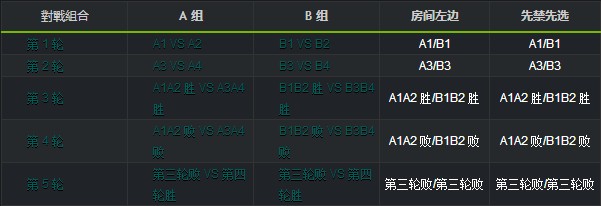 小组双败赛由各小组序号靠前的队伍在房间左边、先禁先选;具体详情参照(表1)