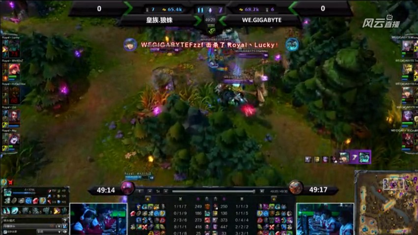 皇族在WE高地上又一次强行开团,大虫子在前排吸收了较多伤害,微笑输出环境良好,最终WE完成1换3,WE抓住机会果断拿下大、小龙,再次破掉中路水晶。