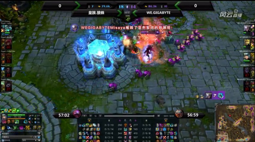 双方开始在大龙视野上做文章。皇族几次团战都占了上风,首先拿下大龙破掉WE上路,双方各种心理博弈,相互牵扯,最后开始了换家。WE成功在劣势阶段用上路水晶换掉对手中塔与中路水晶。一段时间后大龙处一波团战皇族成功一换三。眼看WE要一波带走,草莓大虫子立功,抓住了对手的节奏脱节,在高地上击杀了薇恩和露露。