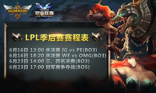 6月16日LPL季后赛半决赛将在江苏太仓loft工业园进行,常规赛第一(IG)将迎战第四(PE);第二(OMG)则会对阵第三(WE)。半决赛采用BO3赛制,排名靠前的队伍有优先选择先蓝色或是先紫色开局的权利。6月23日LPL季后赛决赛移师上海浦东源深体育馆,季军争夺赛采用BO3,冠亚军争夺赛采用BO5。4支精英队伍将向500,000元冠军奖励与王者荣耀发起冲击,精彩对抗拭目以待。