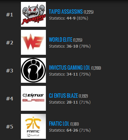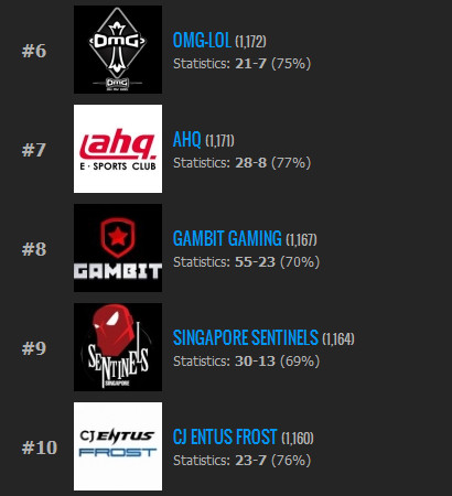 战队排名,受OGN比赛影响,CJ ENTUS FROST从第四位滑落至第十位,CJ ENTUS BLAZE由第六位上升至第四位。AHQ新入榜,排名第七,SWORD跌出前十。