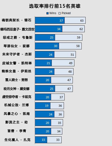 数据统计自6大联赛的127场比赛,新加入的赛事有:上海全明星赛、OGN春季决赛、OGN春季小组赛、腾讯LPL、NLB春季赛和GPL夏季赛。