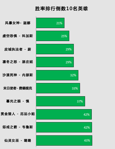 风暴女神- 迦娜,她是五月胜率最低的英雄。关于这个英雄更有趣的数据是,在成功率方面,她的胜率一直在稳定下降,3月的时候是61%,4月的时候降到了42%,现在5月是21%(小编吐槽:快成等差数列了哦)。由于没有明显的削弱,迦娜胜率的下降可以解释为,现在阵容趋向于使用进攻型辅助英雄,比如
