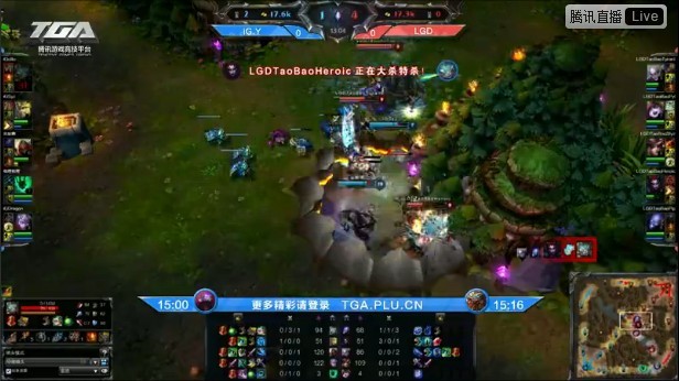 开场iG.Y在分路上的判断失误,兰博在进入野区骚扰瑞兹时,反被蜘蛛抓住,交出一血。9分钟时,LGD抓住皇子回家的时机拿下小龙,iG.Y推塔弥补经济。中期双方多次小规模交战,进行了一些人头互换,之后iG.Y集结中路推塔,却被LGD反扑,损失3人。