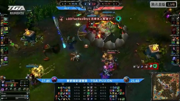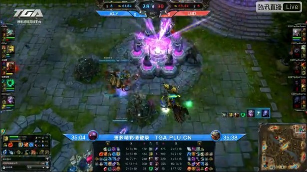 后期,LGD在高地上先手秒掉锤石,反推时被韦鲁斯配合锤石杀掉3人,而iG.Y在能够一波的时候却选择集火露露,反被LGD全部留在高地,被LGD团灭。LGD拆基地塔时,不料中路水晶复活,延缓了他们一波的节奏。之后女警又浪费输出在复活的皇子身上,iG.Y的基地只有十分之一的血量被保住。惊出一身冷汗的iG.Y顺势反扑,在高地上收掉了对手的瑞兹,取得了首场胜利。