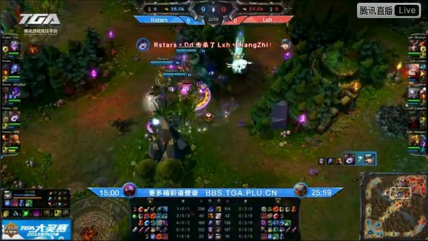 比赛进行到17分钟,Rstars已经拔掉对手所有外塔,双方在高地交换技能后Rstars直接选择大龙。而LXH直到22分钟才在对手破高地时才拿到第一个人头。Rstar的螳螂在23分钟时已经刷到了恐怖的289刀。25分钟时LXH终于抵挡不住Rstar推进的脚步,Rstars轻松取得开门红。