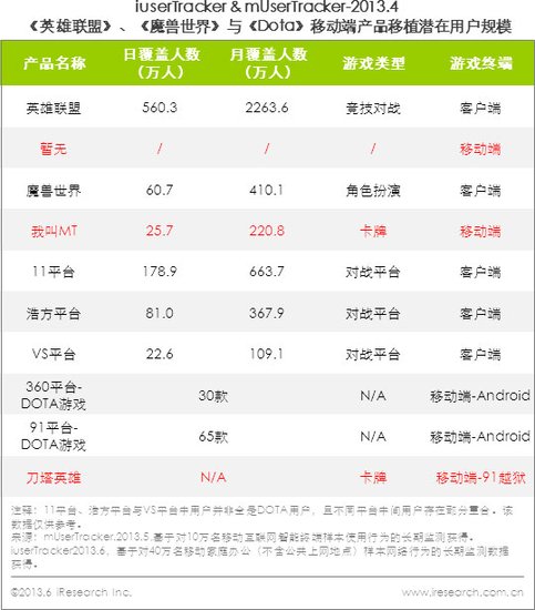 目前类DotA市场成为一块香馍馍,各大厂商都力图在这片土地上分一杯羹,那么现在类DotA市场谁为王?由于DotA是没有客户端的,所以只能统计各平台的用户量。据艾瑞咨询6月份发布的4月份数据统计:《英雄联盟》日覆盖人数达560.3万人,而11、浩方、VS等三家主流对战平台则只有282.5万人,这还不包括非DotA用户及重叠用户。不过国内也有很多DotA玩家限于各种原因是在玩单机。LOL日覆盖人数超DOTA一倍,为魔兽9倍。