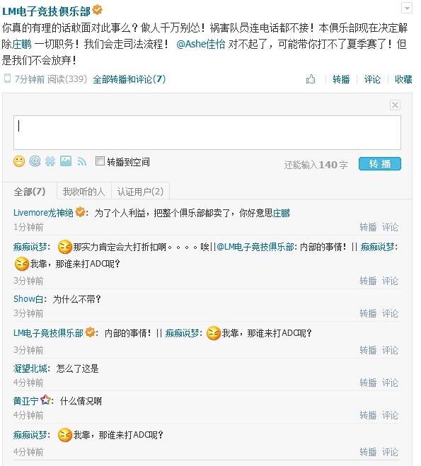 LM电子竞技俱乐部的发表微博表示,LM经理因个人原因出卖俱乐部,使得战队ADC Ashe佳怡或将无缘LPL夏季赛。但是在小编发布新闻的时候,原微博已经被删除,具体原因未知。更多详情请关注我们的后续报道。