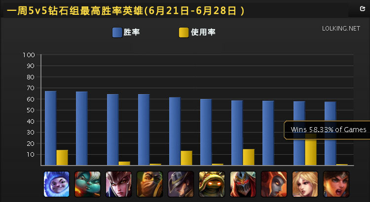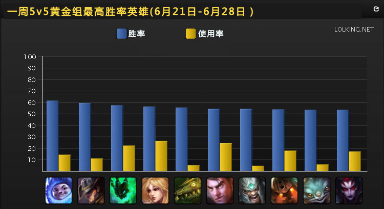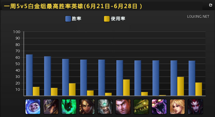 5v5排位白金组,努努、卡牌、锤石胜率为前三名。