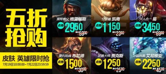 五折抢购,皮肤英雄限时抢。本期五折皮肤有:天人合一 易、黑帮教父 格雷福斯、空手道 凯南;五折英雄有:影流之主 劫、未来守护者 杰斯、复仇焰魂 布兰德、狂暴之心 凯南、冰晶凤凰 艾尼维亚 、武器大师 贾克斯。点击购买>>>