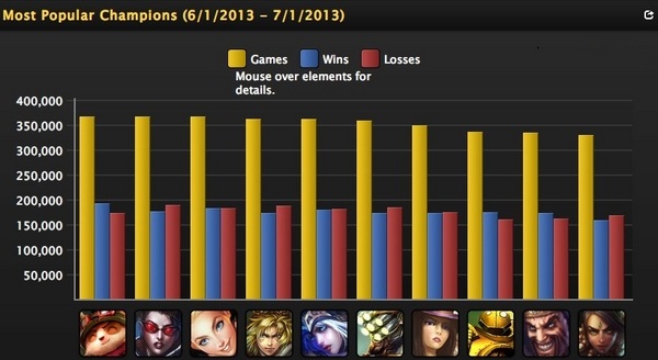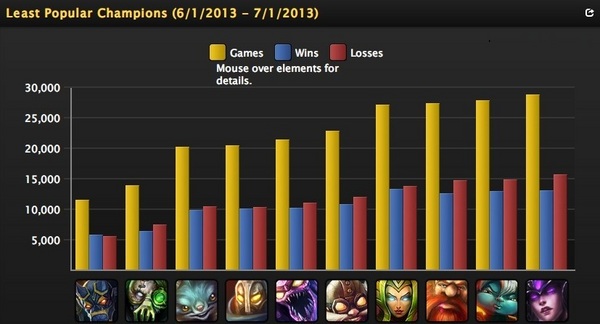 最受欢迎英雄,提莫队长勇夺榜首 (黄色是场次,蓝色是胜场次数,红色是败场次数)