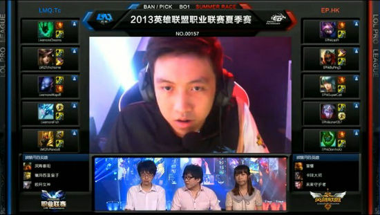 英雄联盟职业联赛夏季赛第一周第二比赛日第二场比赛由LMQ迎战EP.HK。LMQ ban掉了泰坦、皇子、皎月,ER.HK ban掉了盲僧、卡牌、杰斯;LMQ选择了锤石、女警、瑞兹、凤凰、狗头,EP.HK选择了凯南、劫、琴女、维鲁斯、扎克。