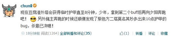 今早,Riot平衡设计师chunli(李淳)在自己的微博爆料:“现在豆腐渣外塔会获得临时护甲直至8分钟,少年,拿到第二个buff后再向夕阳奔跑吧!另外施主奔跑的时候还顺便发现紫色方二塔莫名其妙多出来10点护甲的BUG,杀意已决,嗯”