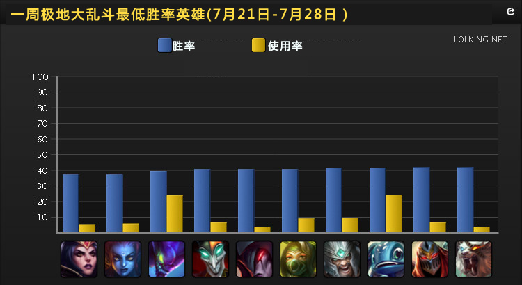 极地大乱斗低胜率榜。妖姬、寡妇双双垫底。暗裔剑魔亚托克斯胜率为倒数第五名。