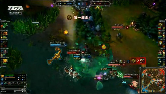 PE开局选择中二优先薇恩的发育,双方在前期都非常谨慎,9分钟OMG迅速偷掉小龙,第二条小龙双方爆发团战,OMG4换1拿下小龙建立优势。随后上路一塔互推OMG完成0换4顺手拿下大龙奠定巨大的优势。