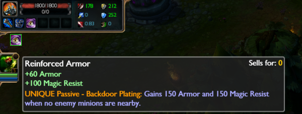 唯一被动 - 镀金后门:当没有敌方小兵在附近时,获得150点护甲和150点魔法抗性