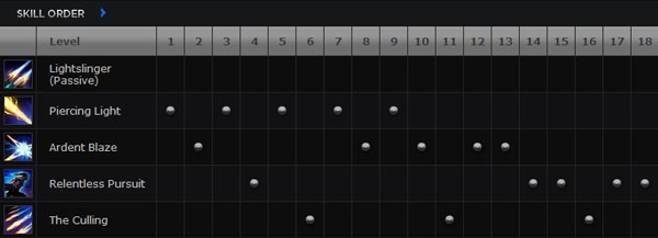 解释:这是一个不错的被动,对于ADC而言,这是一个加成技能,让你在后期也有不错的表现。你使用技能后,你的下一个普攻将会攻击2下(伤害取决于你的等级)。理想情况下,平砍+技能+平砍能最大化输出。