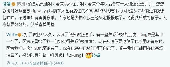 昨夜,皇族战队中单White微博爆料,PE的打野选手JING将要退役。JING本人也转发微博证实了这一点: