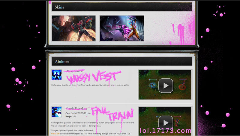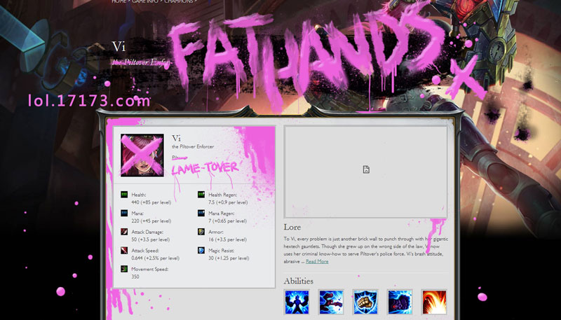 美服官网惊现“皮城执法官蔚”被黑的资料页,意味着新英雄即将登场,而且是蔚的死敌。根据美服论坛小伙伴的猜测,她可能是蔚的姐妹。整个版面都被粉红色的涂料所抹上,让人想起PAX展会上的泳池海报,未露面的英雄就涂有粉红色的指甲。