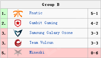 Fnatic在第一场战胜Gambit,Ozone和Gambit随后战胜Vulcun之后,小组积分将出现平局。Fnatic小组第一出线。而Gambit和Ozone将通过加赛,胜者出线。