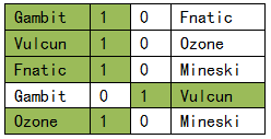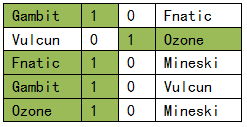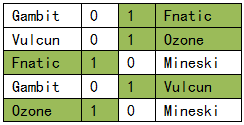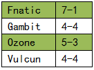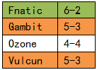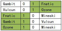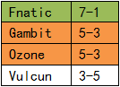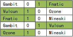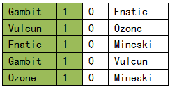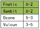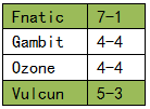 第一场Fnatic获胜,随后Vulcun双杀Ozone和Gambit。这样子Fnatic和Vulcun会晋级八强。