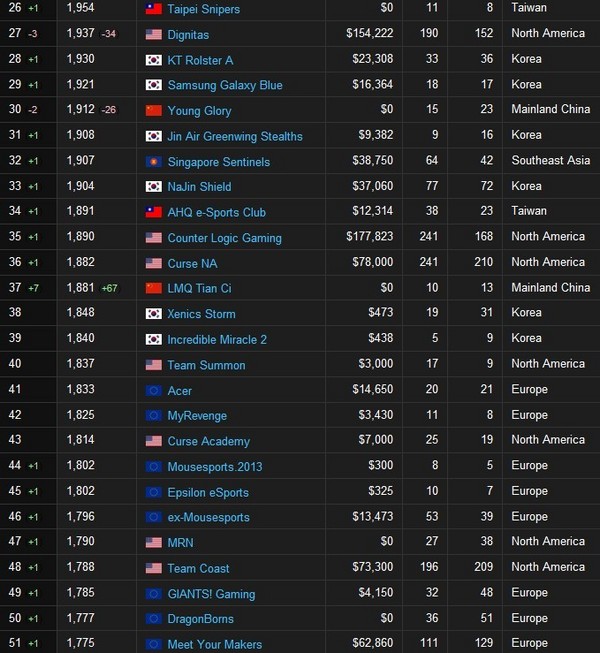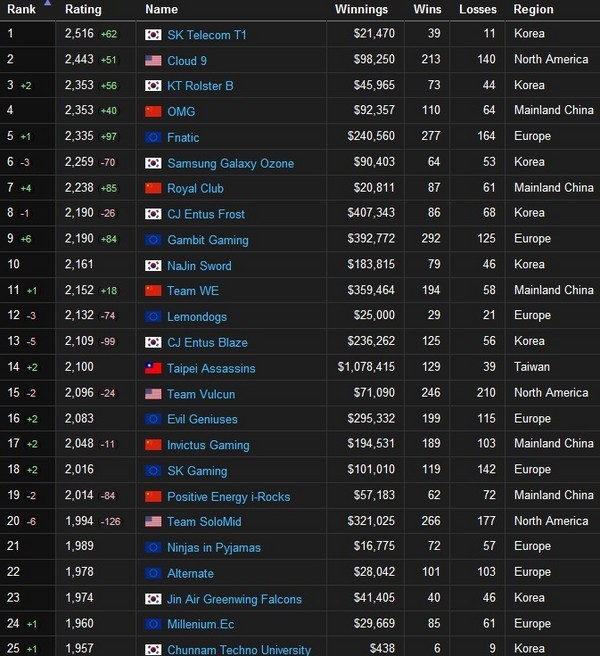 中国战队中成绩最好的是OMG排名第七,比较大的变动是SSO因为小组赛的坑爹表现下滑三名,而皇族由于预选赛夺冠攀升4名,GMB小组出线攀升6名。