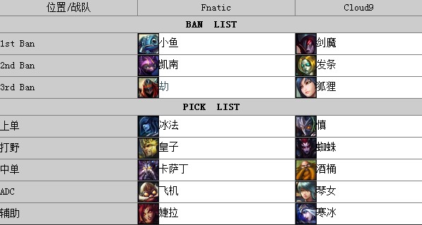选人上看出,C9想利用寒冰的先手大招配合酒桶大招在开团前强行放倒FN这边一个人,达到一个以多打少的局面。但是这个阵容冒险程度相当之高,寒冰,一个没有位移的英雄,尤其是碰上FN是飞机和婕拉这个组合的情况下,对线将会非常劣势,而且,对手还有皇子 法爷这种致命的控制再配合卡萨丁,瞬间就可将寒冰带走,这场对于Sneaky来讲是一场极其考验自己寒冰能力的一场比赛。选人想法非常不错,FN这次又是双传送闪电战的套路,不过C9拿到了慎,一个分推英雄,在我前几天的帖子有提到过,慎是很克制FN这种闪电战的。