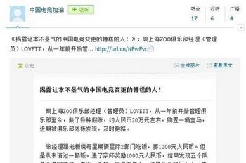 刚刚不久前,一名网名为“中国电竞加油”的网友发布了一条名为《揭露让本不景气的中国电竞变更的糟糕的人!》近千字的博文,内容主要为“揭露中国ZOO电竞俱乐部经理,前星际1、2职业选手LoveTT做假账被发现后离队”的事件
