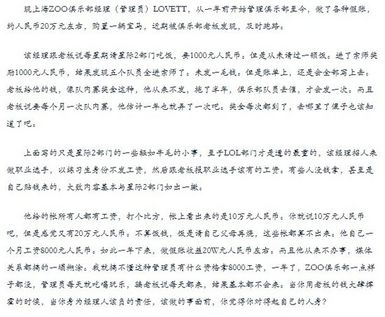 上面写的只是星际2部门的一些轻如牛毛的小事,至于LOL部门才是遭的最重的,该经理招人来做职业选手,以练习生身份不发工资,然后跟老板报职业选手该有的工资。有些人没钱拿,甚至是自己贴钱来的,大致内容基本与星际2部门如出一辙。