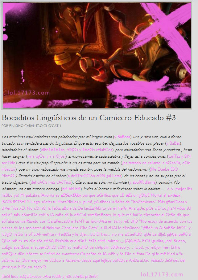 金克丝的恶搞仍在继续!虽然官网已正式公布她的技能信息,同时她也在测试服上出现了,但恶搞英雄行为仍在进行。这次的对象是虚空恐惧科加斯,比较特别的是,是恶搞拉美服务器上的一篇有关他的文章。