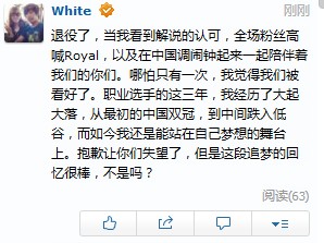 White(@Wh1t3zZ): 退役了,当我看到解说的认可,全场粉丝高喊Royal,以及在中国调闹钟起来一起陪伴着我们的你们。哪怕只有一次,我觉得我们被看好了。职业选手的这三年,我经历了大起大落,从最初的中国双冠,到中间跌入低谷,而如今我还是能站在自己梦想的舞台上。抱歉让你们失望了,但是这段追梦的回忆很棒,不是吗?
