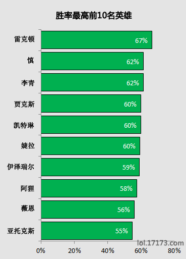 雷克顿的力量。然而,他在S3世界冠军联赛上被使用,还要归功于皇族的Godlike。在一些装备的加成下就可以造成成吨的伤害,非常强力的对线英雄,后期发育好的话非常强,在该表中他的胜率第一。排在他后面的是慎、