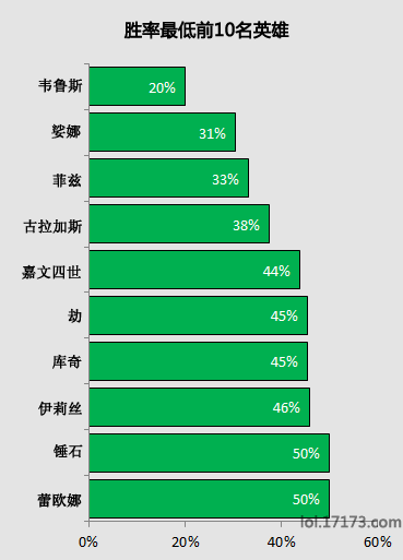 韦鲁斯的胜率很低,只有20%.接着是娑娜、菲兹和古拉加斯,尽管这三位英雄都有很好的通用性,但胜率不高。